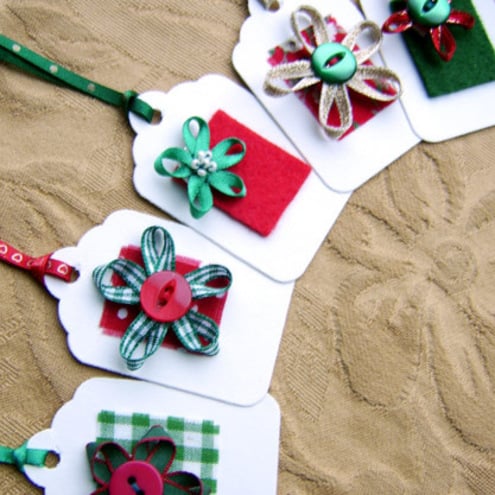 This is a set of 5 hand made gift tags featuring ribbon flowers in festive colours. Each are mounted onto white card labels with ribbon ties. Approx size = 5.5cm x 3.5cm.