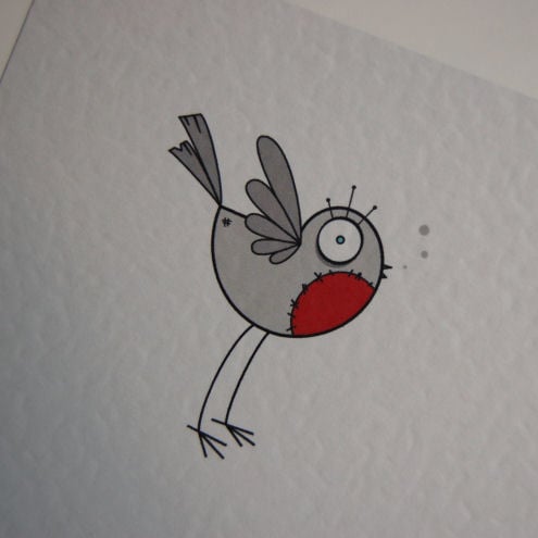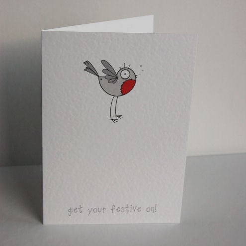 unique and quirky illustrated christmas card featuring a zombie robin. he insists that you get your festive on - otherwise he might come and peck at your braaiinssss! it is blank inside for your message.