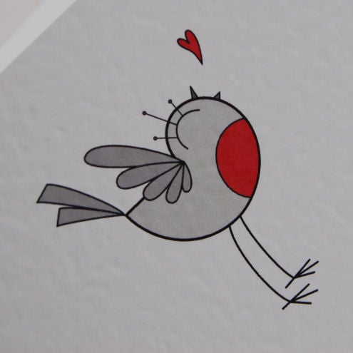 unique and quirky illustrated christmas card featuring a happy robin. he wishes you seasons greetings and lots of love! it is blank inside for your message.