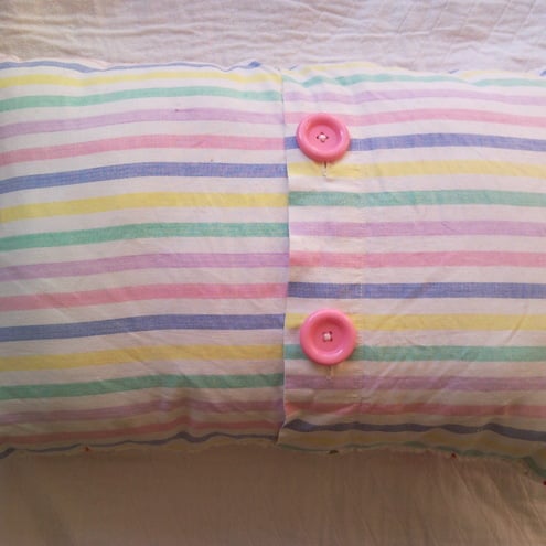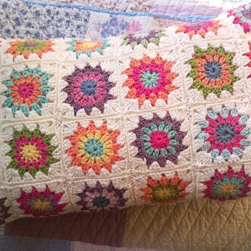 Crochet cushion backed with vintage candy striped cotton. Two big pink buttons close the envelope back.