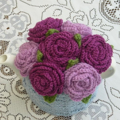The cosy has been handmade using good quality yarn in grey. The top of the cosy is decorated with seven individual roses in plum and dusty pink with green leaves.