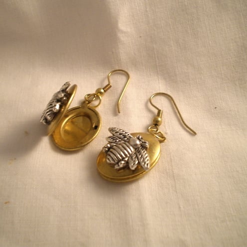 Here are a pair of cute unusual earrings... miniature brass lockets have been adorned with antiqued silver tone bees.