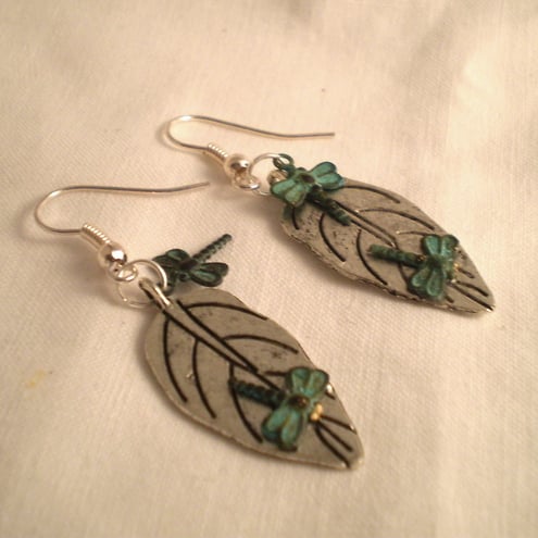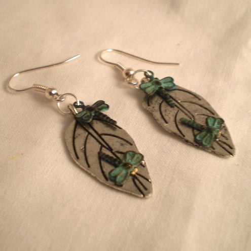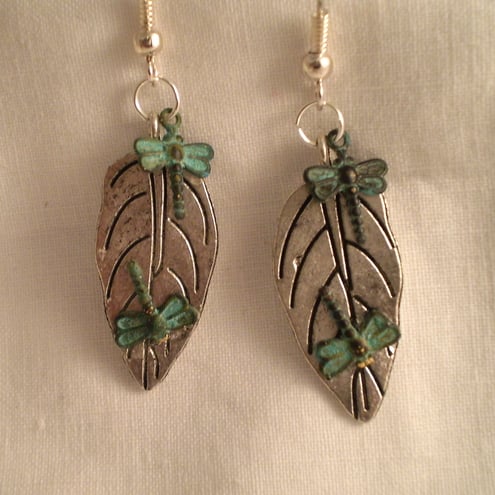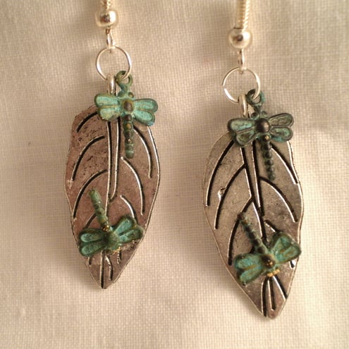 Miniature verdigris dragonflies rest on antiqued silver tone etched leaves to create these whimsical and unusual earring.