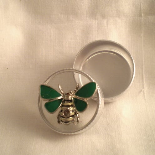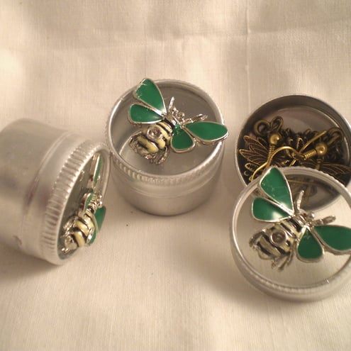 The tins are metal with a clear glass top, which I have embellished with an enameled bee charm. They will hold a chain or small pendant, a ring or pair of stud or small earrings.