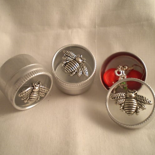The tins are metal with a clear glass top, which I have embellished with a antiqued silver bee charm. They will hold a chain or small pendant, a ring or pair of stud or small earrings.
