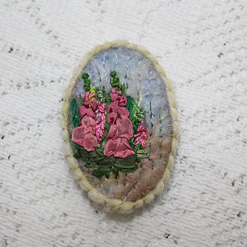 Spikes of foxgloves contrast with the felted background of this embroidered brooch.