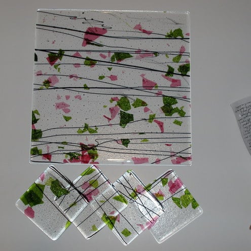 These are hand cut from high quality Bullseye specialist fusing glass, and fired in my kiln. Each coaster is 10x10cm, and 6mm thick. I have fully annealed them to ensure they are strong and durable.