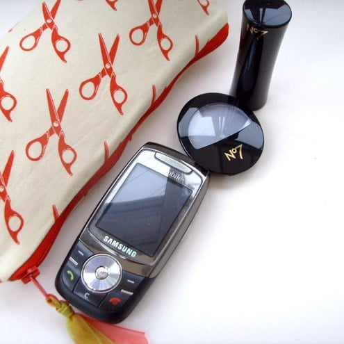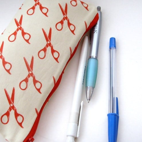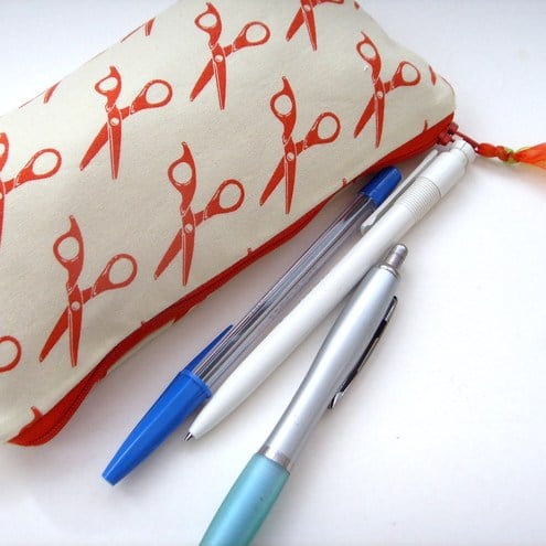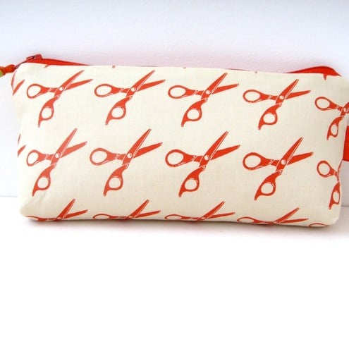 Cute little red scissors make up bag / pencil case with contrasting zipper, ribbon and lining
