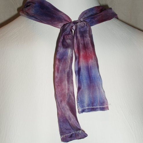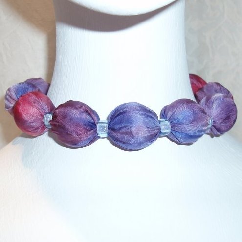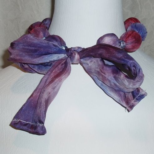 A beautiful piece of medium weight silk, hand painted by me in lovely shades of purple, mauve and pink, and crafted into a fantastic necklace with high quality light blue glass spacer beads.