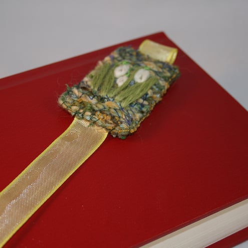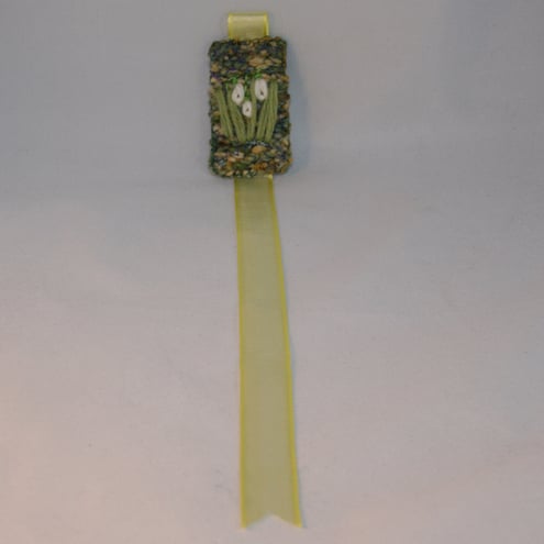 A clump of snowdrops, hand embroidered in a mixture of tapestry wools and embroidery thread, nestle against the felted background of the decorated panel of this bookmark.
