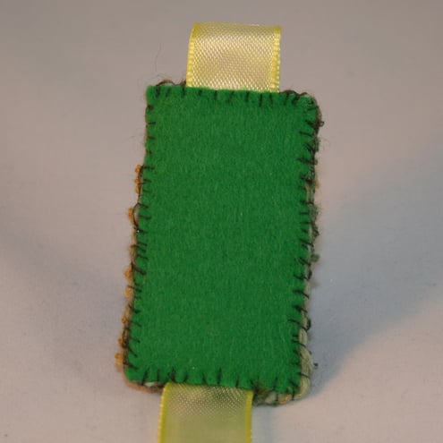 The decorated panel has been formed from a piece of handknitting, fulled (or felted) to give a closer texture, and machine basted to a thick woolen fabric. The snowdrops have been embroidered onto this panel. The back of the panel is neatened with felt. Couching over a yarn in greens and yellows, frames the design.