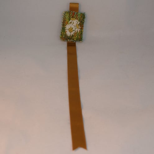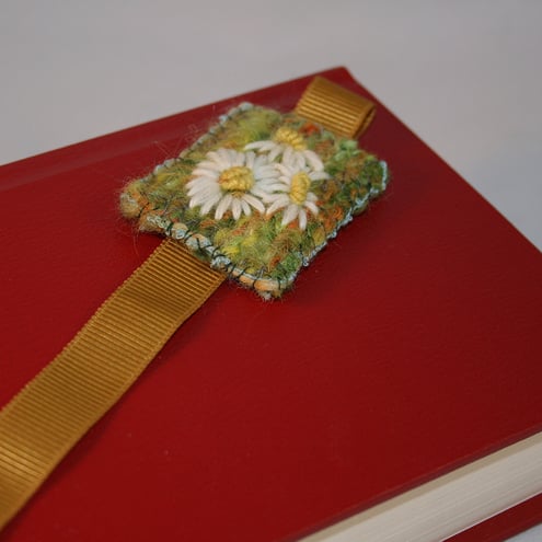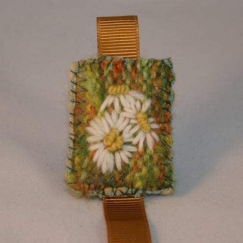 The decorated panel has been formed from a piece of handknitting, fulled (or felted) to give a closer texture, and machine basted to a thick woolen fabric. The daisies have been embroidered onto this panel. Felt is stitched in place to neaten the back of the panel. Couching over a yarn in greens and yellows, frames the design. The 'tail' of the bookmark is a length of ribbon.