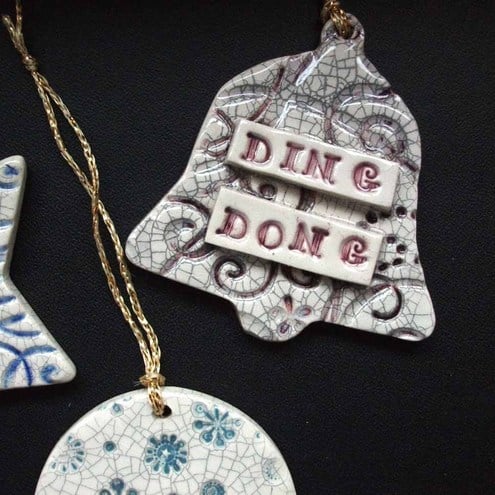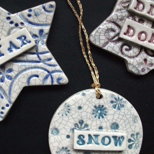 These shabby chic Xmas decorations are made from white earthenware clay and decorated with coloured slips and glazes.
