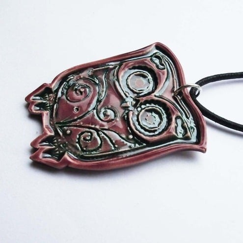 Pendant size 45mm x35mm on a 17" black leather thong with silver plated findings and lobster clasp.
