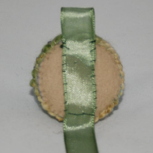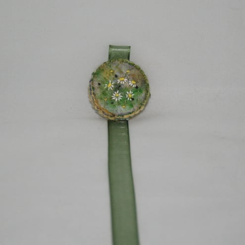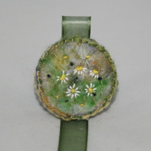 The daisies have been stitched onto a hand felted background, of merino, mohair and silk fibres. The plaque is formed by stretching the design over a recycled plastic bottle top. The back is neatened with commercial felt. Couching over a yarn in blues and greens, frames the design. The 'tail' of the bookmark is a length of green ribbon.