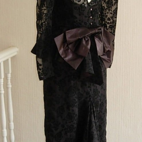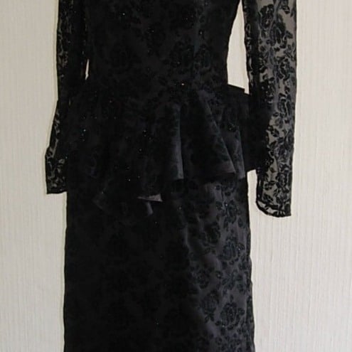 It is elegant with a black satin sheath style dress with a strapless fitted black satin under bodice. It has a fitted peplum from the waist to the hip and a flocked black soft organza overlay.