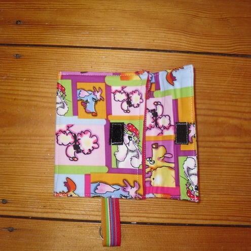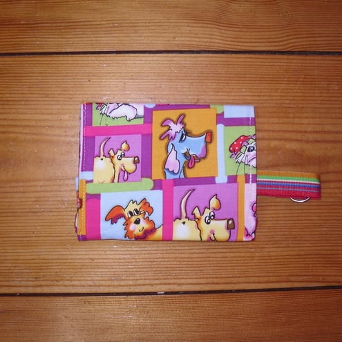 This fantastic bright zippered coin purse is created from 100% cotton animal cartoon print fabric. It has a fold over flap with velcro fastening, a section for credit cards and a zippered section for coins. I have also sewn a split ring to the purse, so it can be attached to the inside of your bag. The purse measures 3.5" by 4.5".