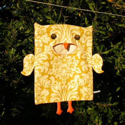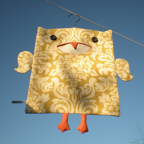 A little yellow owl pegbag – very nicely house trained , so he only eats pegs; no icky stuff!