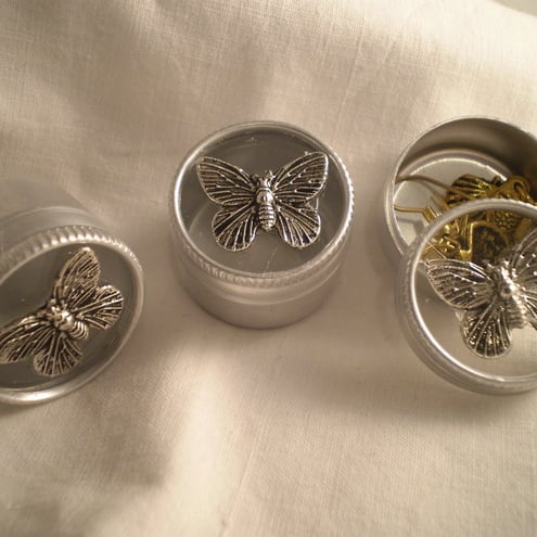 The tins are metal with a clear glass top, which I have embellished with a antiqued silver butterfly charm. They will hold a chain or small pendant, a ring or pair of stud or small earrings.