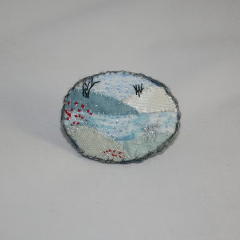 Scraps of fabric, in muted shades of icy aqua, are appliqueed in place to form the design for this brooch.