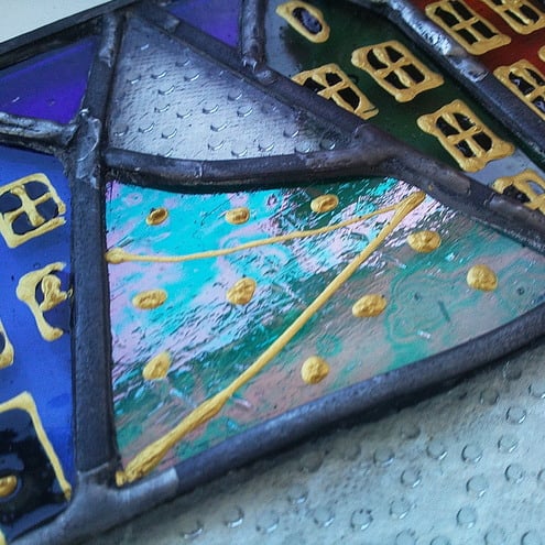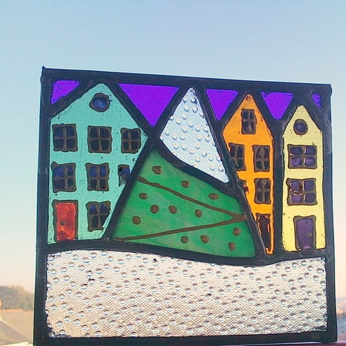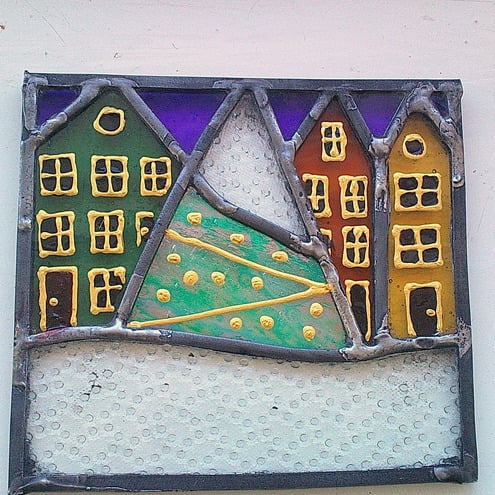 Add a seasonal touch to your home with a lovely quirky little winter village scene with houses and shops, fir trees and snow! Made from recycled and reclaimed stained glass, made using traditional leading techniques and painted detail. The Christmas tree uses glass with a fantastic iridescent luster and the textures of the clear glass suggest snow