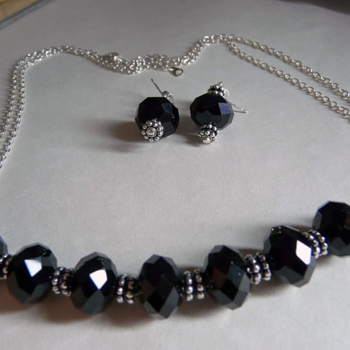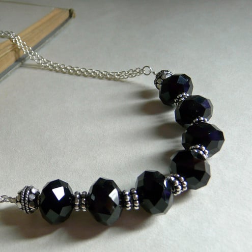 Beautiful deepest black facetted rondelles, with silver plated spacer beads. This necklace a real show stopper and a perfect way to glam up your party outfit.