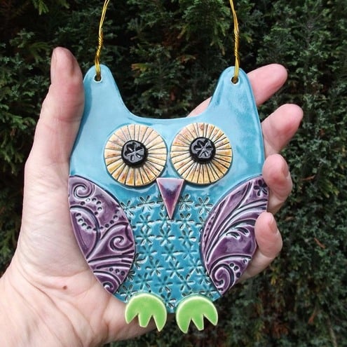 This cute ceramic owl is made from white earthenware clay with all the individual pieces hand cut and decorated.