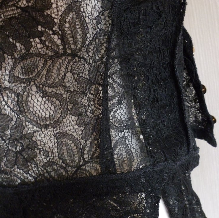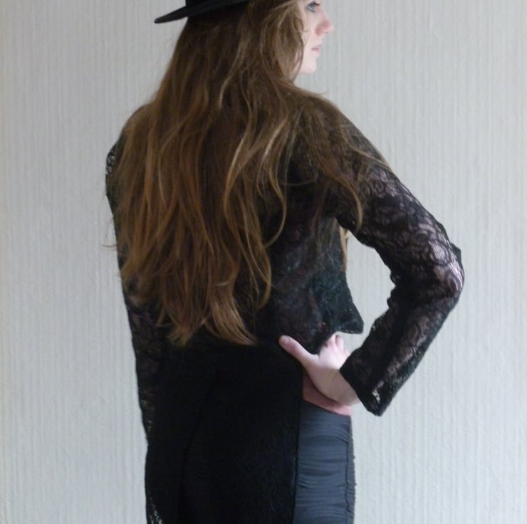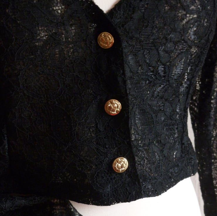 Very pretty little cropped lace Tail Coat jacket with full length sleeves and button front fastening.