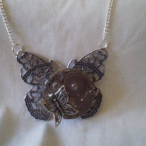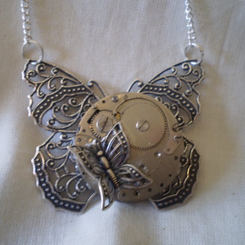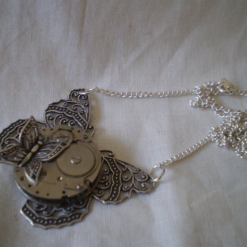 A butterfly has landed to rest on the Vintage watch movement that adorns this lovely butterfly necklace. The watch has been placed on an antiqued silver open work filigree base.