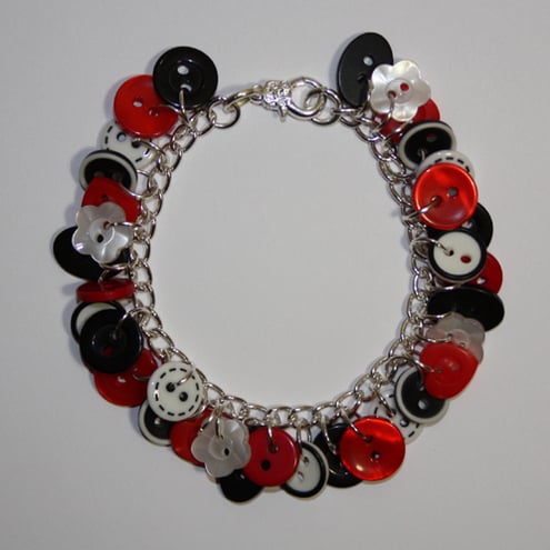 This distinctive button bracelet is rich with an assortment of red, black and white buttons.