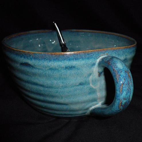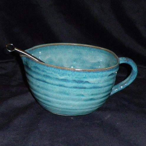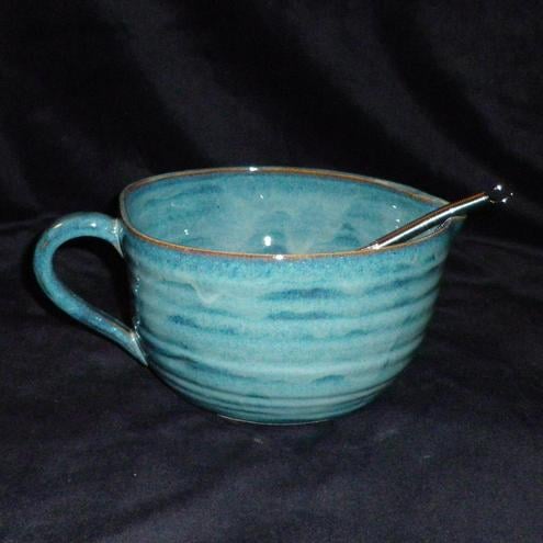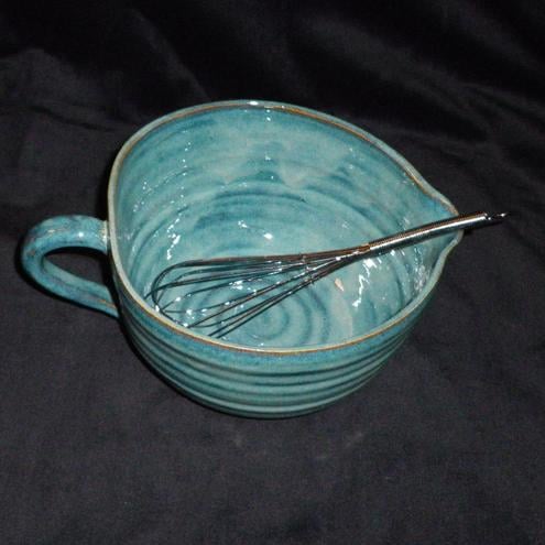 This batter bowl was thrown on my pottery wheel using strong white stoneware clay.