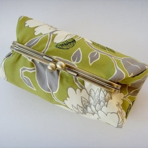 Perfect little clutch for your mobile phone, keys, sunglasses,change and credit cards or even a make-up bag. Pretty Amy Butler Tree Peony fabric with contrasting lining, padding and metal frame clasp.