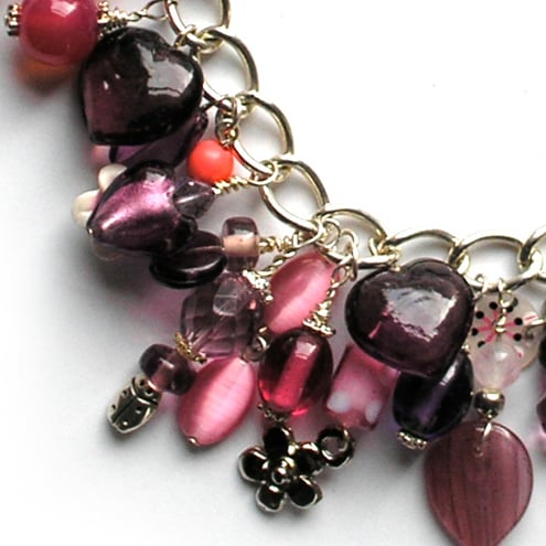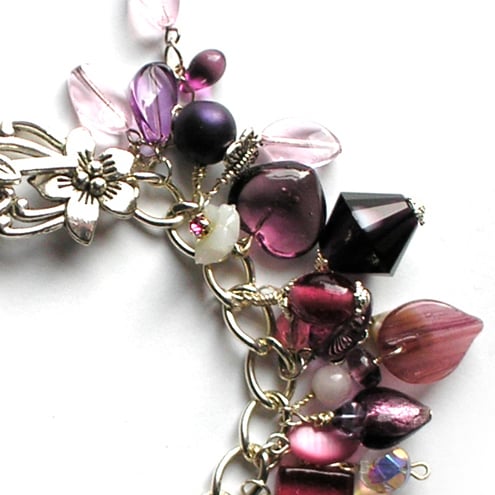How about a delicious serving of summer pudding to warm the cold spring days? Silver plated bracelet with flower toggle clasp, jam-packed with oodles of beads and charms all lovingly handwrapped by me. This gorgeous recipe contains cranberry and amethyst glass beads, Indian glass roller beads, semiprecious amethyst chips, glass cross and hearts, vintage beads and charms, and lots of Tibetan silver charms and creatures. Random elements will vary due to availability (and just to keep things interesting!) but will always follow the style illustrated. Your bracelet will be lovingly wrapped to ensure a safe delivery.