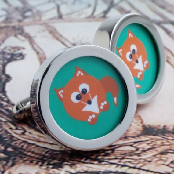 Woodland fox cufflinks with original artwork by British designer Victoria Hopkins. Very cute and lots of fun, these cartoon foxy fox woodland cuff links will brighten up the day.