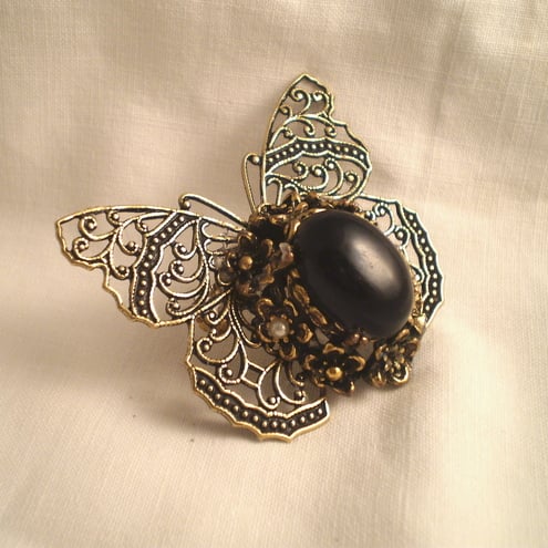 This beautiful ornate Victorian style brooch was created from a rescued 1940's earring with a black glass cabachon and sweet little pearls and placed on a filigree butterfly stamping.