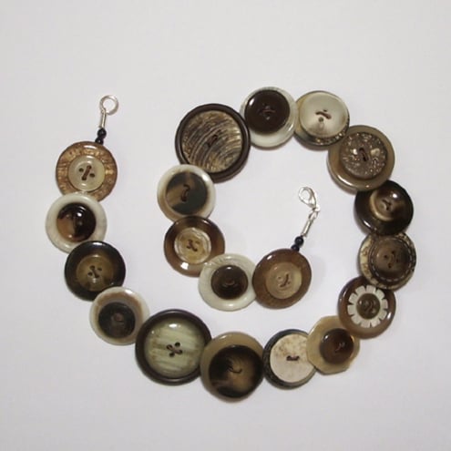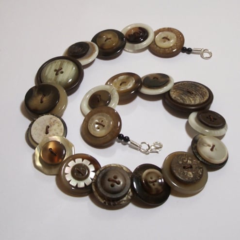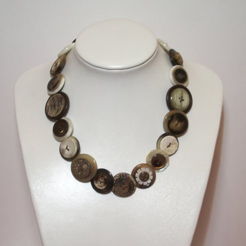 This distinctive button necklace is rich with an assortment of coffee and cream coloured buttons.