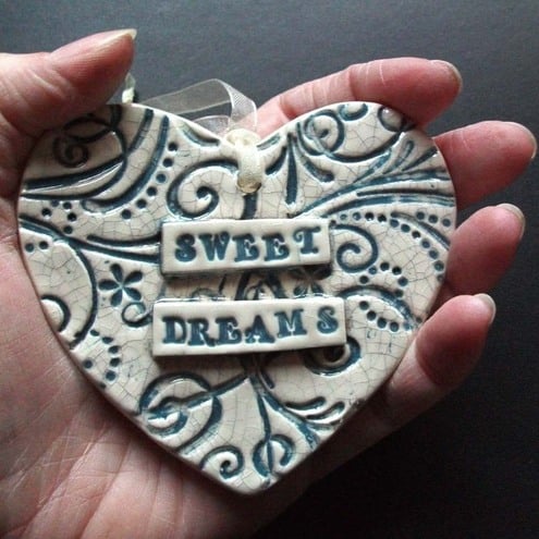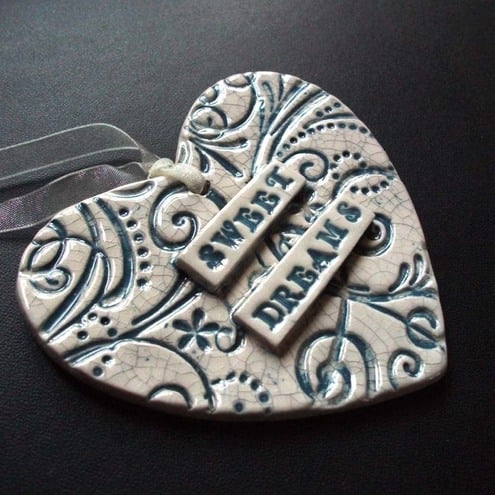 This ceramic heart is made from white earthenware clay and decorated with the words "Sweet Dreams" It has a blue swirly background finished off with a crackle glaze for a shabby chic look.