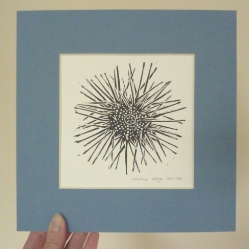 Original lino cut print "washed up". I found this sea urchin on the beach and, thinking it may still be alive, threw it back into the sea. I then wished I had taken a photo and had to rely on a sketch from memory instead.