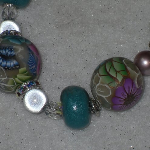 Seven matching polymer clay beads created myself using butterfly, flower & leaf canes, and gold leaf. Colours include turquoise, cerise and green roses, white ghost flowers and aqua and magenta flowers with pearl and glitter background. Filler beads include Swarvoski crystals & pearls, illusion beads and mini tibetian silver beads. Fastens using toggle clasp. This is a smallish adult or teen/child size bracelet measuring approx. 19cm.