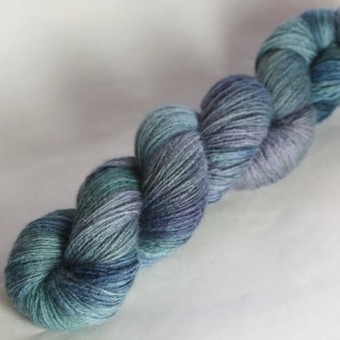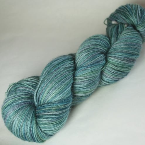 Soft greens and blues with hints of purple and grey come together in this lovely, soft and slightly lustrous sock yarn. The yarn has been reskeined as shown in the first two photographs, but is shown in the third photo before reskeining, for reference only.Please note, skein is a little more green than the photos suggest.