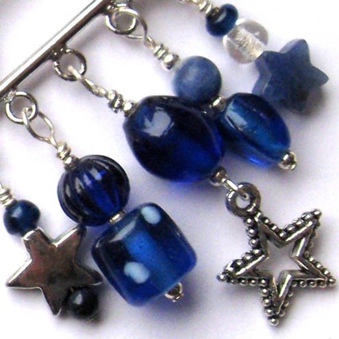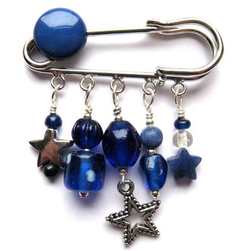 Fab chunky handmade Rainbow Pin in gorgeous shades of indigo and silver. This one makes me want to sing "starry starry night..."Silverplated pin with handwrapped beads & charms including semiprecious blue sodalite star and bead, glass lampwork, and Czech glass beads.These little pins are just so versatile! You can use them to cheer up a plain outfit, fasten a scarf, adorn a bag...maybe even to preserve modesty in a kilt? Pin measures just over 2" from end to end.Your pin will be lovingly wrapped in tissue and a suedette gift pouch, then carefully packaged to ensure a safe delivery.