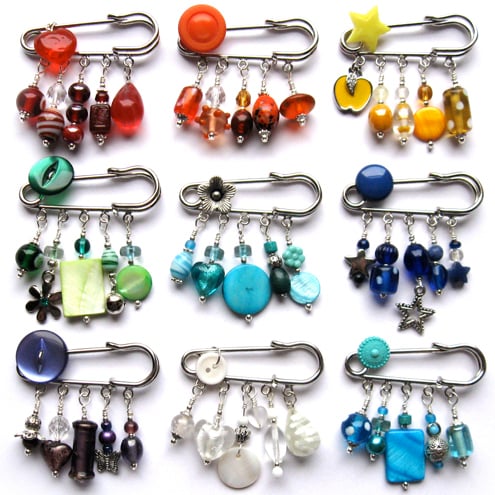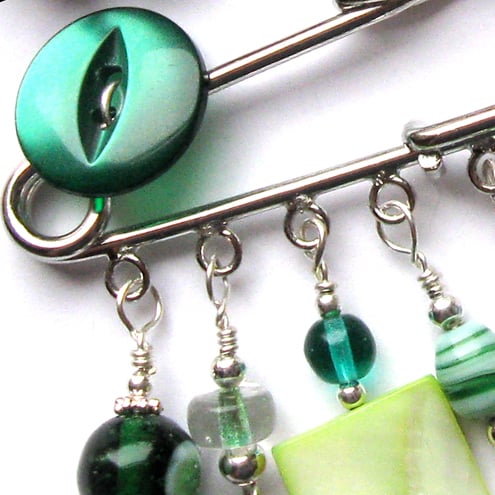 Verdant little handmade Rainbow Pin in gorgeous shades of green and silver. Silverplated pin with handwrapped beads & charms including glass lampwork, Czech glass, shell, a flower, a tiny bell and a button salvaged from a vintage shirt.These little pins are just so versatile! You can use them to cheer up a plain outfit, fasten a scarf, adorn a bag....Every one of my little Rainbow Pins is unique and OOAK, I make sure that they are all different. Pin measures just over 2" from end to end.Your pin will be lovingly wrapped in tissue and a suedette gift pouch, then carefully packaged to ensure a safe delivery.