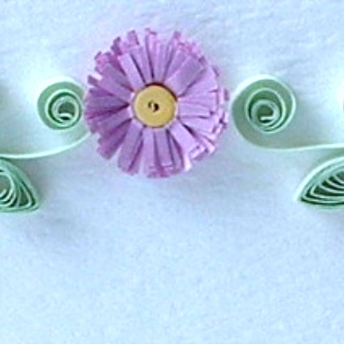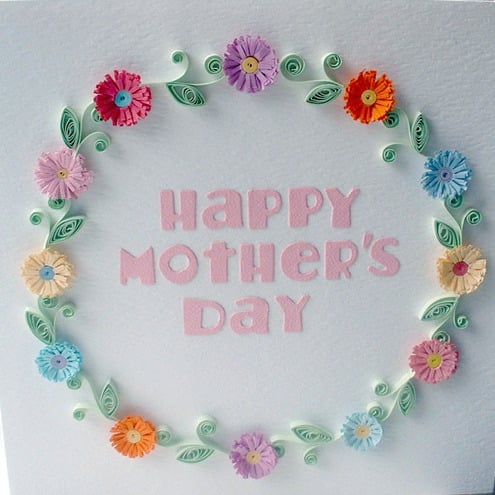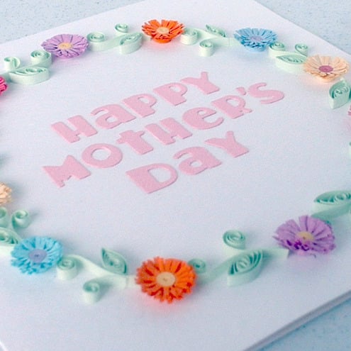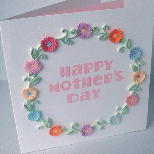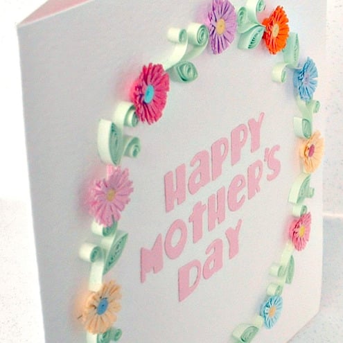 Square white textured background card featuring a die-cut “Happy Mother’s Day” message, surrounded by a circular garland of quilled daisies in pretty colours.