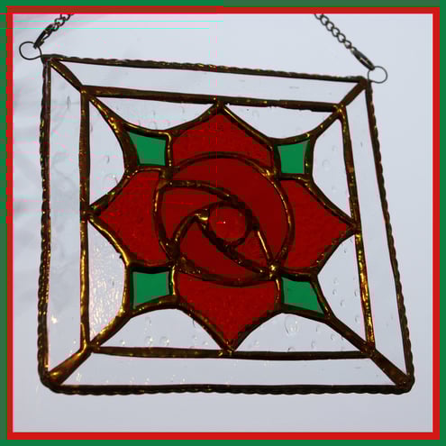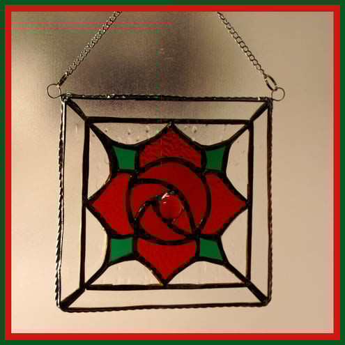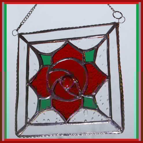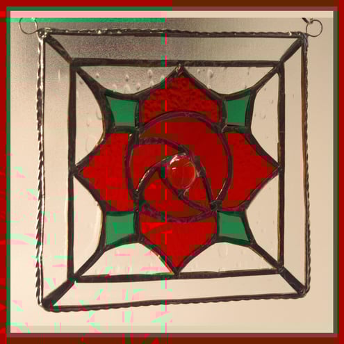 It is a simple, bright red Machintosh style rose made using several different shades and textures of red glass. The centre of the flower is a bright red glass nugget. The flower is in a surround of raindrop clear glass and the square is in a square frame of more clear glass. The picture is then lightly framed with twisted wire which highlights the simplicity and brightness of the flower.