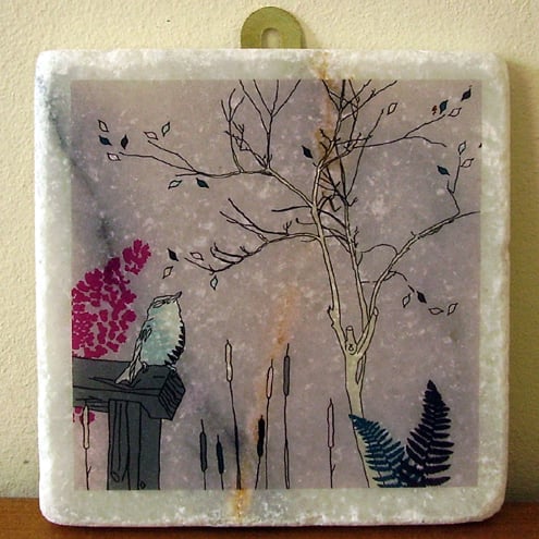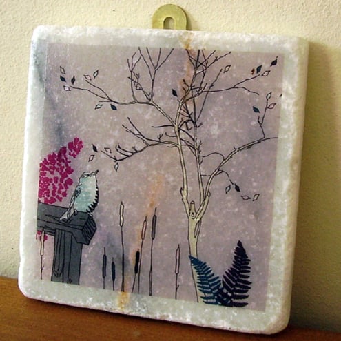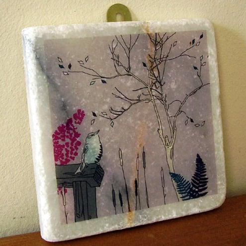 white marble tile featuring an original 'littlebirdy' design to hang on your wall!