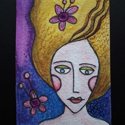 This is a tiny little ACEO original watercolor painting of a lady with flowing hair and flowers.