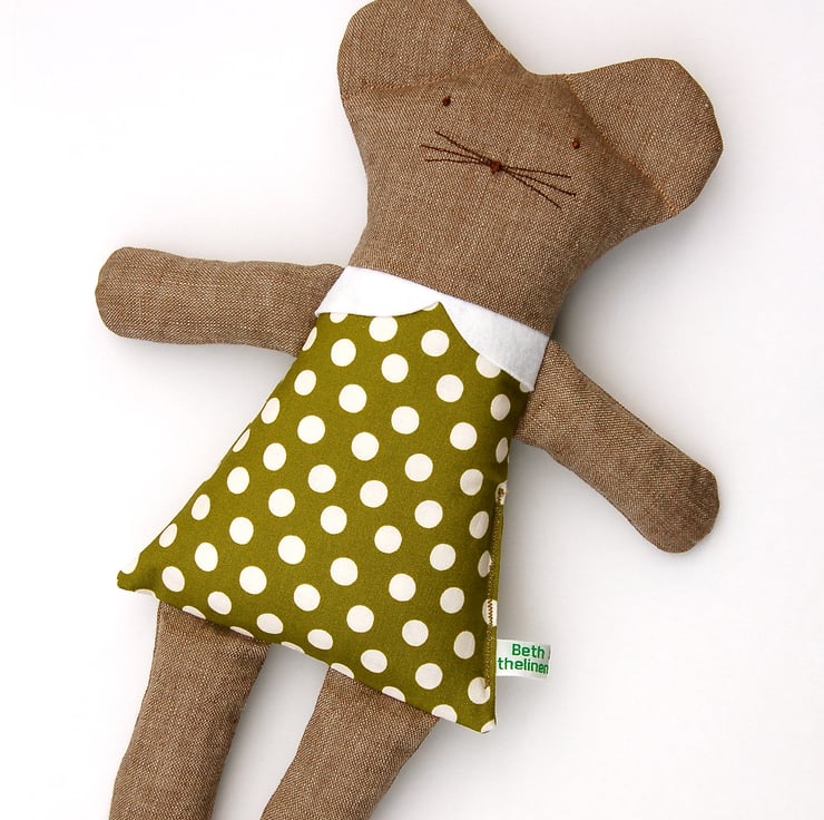 Brown linen mouse, with polyester safety filling and embroidered face.