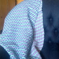 I wanted to create the same effect as weaving with hand-framed knitting using an inlay yarn. This has been achieved by a pretty complicated technique!