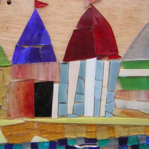Gorgeous one of a kind, recycled stained glass mosaic row of beach huts on a salvaged piece of wood. This a-symetric wall hanging mosaic will look great on the wall. I have used a mixture of recycled stained glass and some mirror pieces to catch the light.