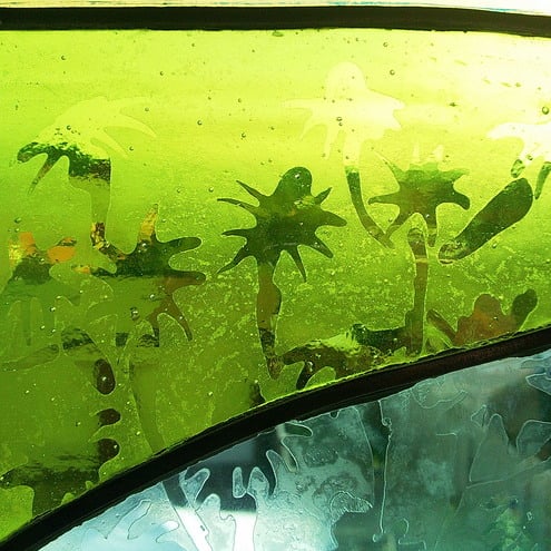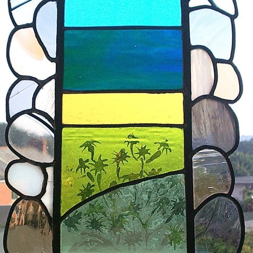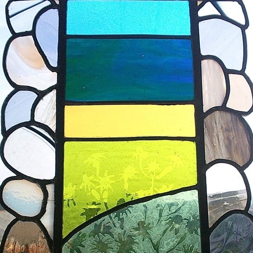 Following a wonderful day on the beach with some good friends this design came to me from some photos I took of the day. All the glass is recycled and includes some wonderful handblown glass for the stones which make up the border.